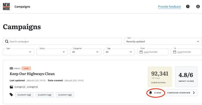 From your dashboard, head over to your Campaigns and look for the Clone button beside your Campaign Overview button.
