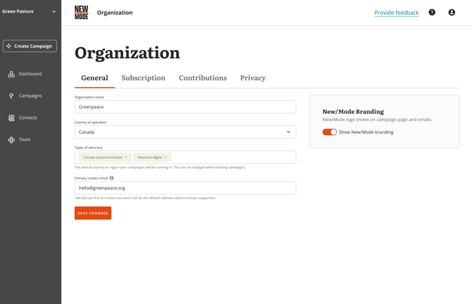 By default, all campaigns will have New/Mode's logo on campaign pages and emails to your supporters as well as your targets. Users on our Growing Organization tier can remove our logo by clicking on their organization's name in the top left corner and then visiting their Organization Profile.