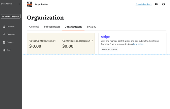 New/Mode will continue to collect contributions and boost your campaign until Stripe Express is configured. Once connected, admin users will be able to see the following sections under their Organization settings on the Contributions tab: