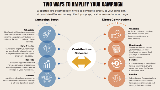 Campaign Boost is a hands-off way to convert grassroots energy into measurable visibility, supporter growth, and impact while New/Mode’s team handles the heavy lifting.